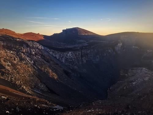 相較於菜市場般的吉田線,「富士宮路線」更顯清幽,坡面變化豐富,火山岩層與山徑交錯展開,行走其間,能更真切感受這座獨立火山的原始樣貌。登頂之後,我們不循原路折返,而是由御殿場方向下山,延伸至寶永山火山口一帶。廣闊的火山砂礫坡、壯麗而裸露的地貌景觀,呈現與上山截然不同的視野與節奏,讓整趟行程不只是「登頂」,更是一段完整而立體的火山地形探索。